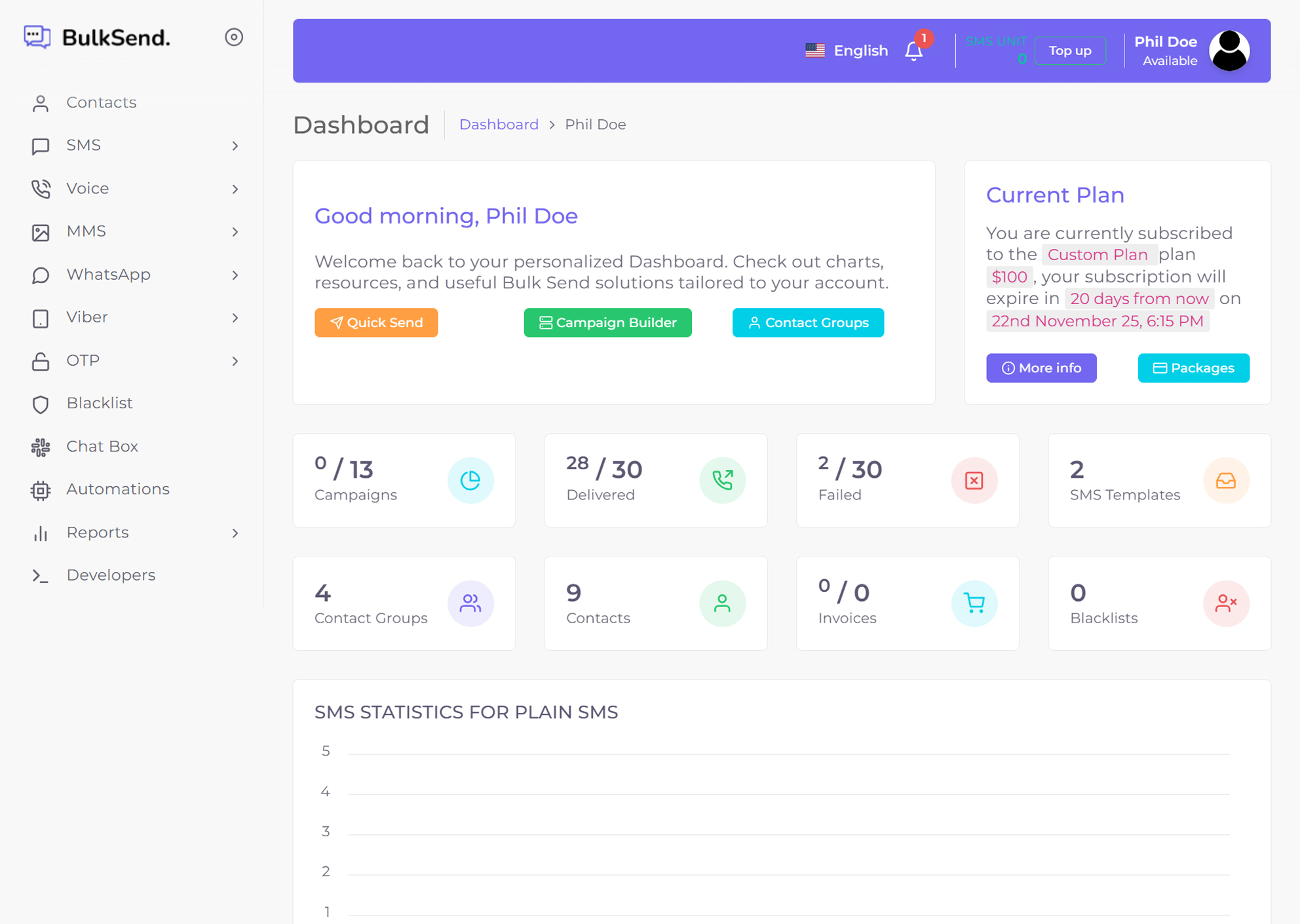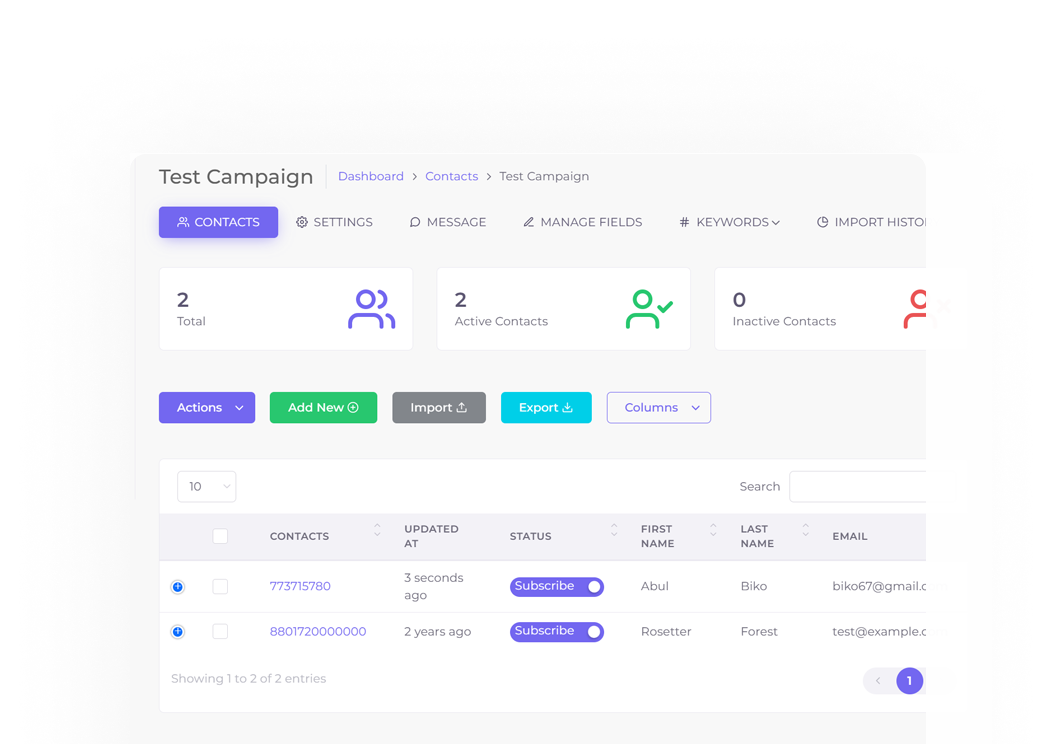 Send personalized campaigns with custom sms templates to contact groups via SMS, WhatsApp, MMS, and Voice.